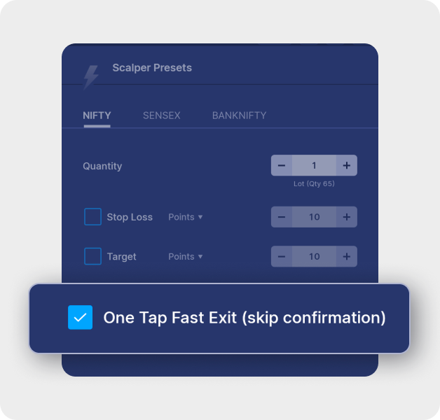 Go to Scalper Joystick Presets → switch on "1-tap fast exit (skip Confirmation)." You'll need to set this individually for each of the three indices.