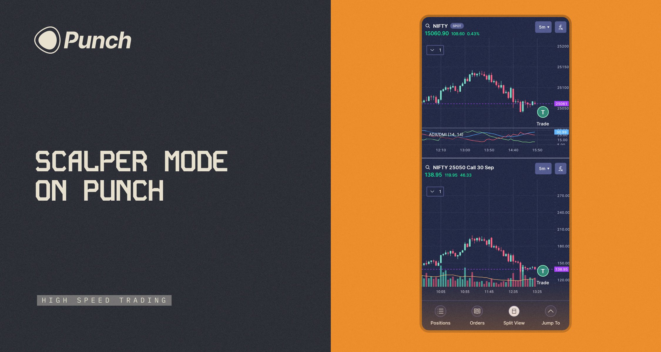 Plot NIFTY + its Call/Put option — perfect for option scalping. Analyze the index, then just tap T on the option chart to Punch in your trade.